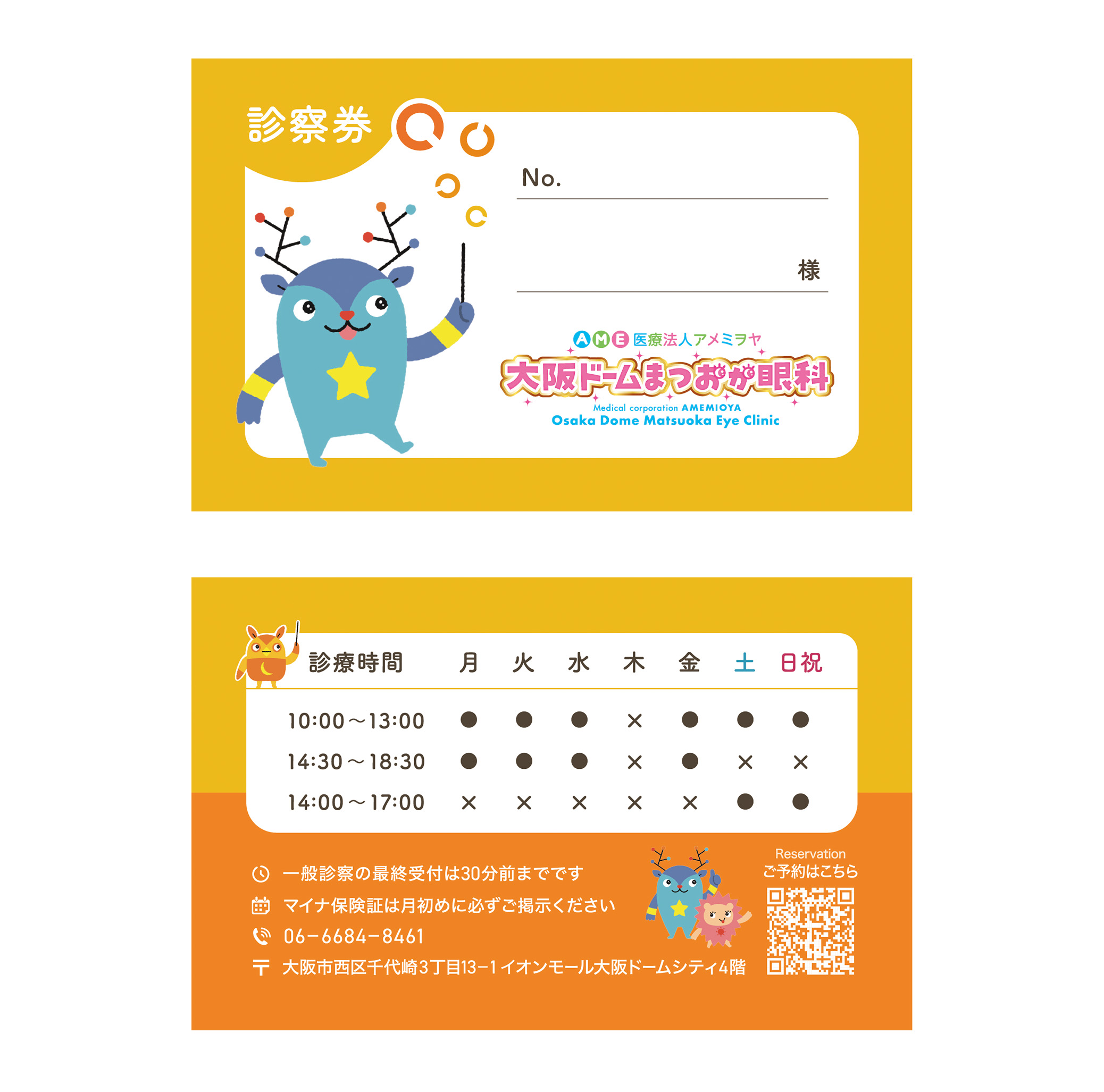 眼科クリニック様 2026 3/19 制作内容 眼科クリニックの診察券デザインを担当。クライアント様支給のオリジナルキャラクターイラストを活かし、クリニックのコンセプトカラーである黄色をベースに、患者さんが持ち歩くのが楽しくなるポップで親しみやすいデザインに仕上げました。■担当範囲・・・デザイン制作■使用ツール・・・Illustrator■制作期間・・・5時間 カード制作 チラシ作成