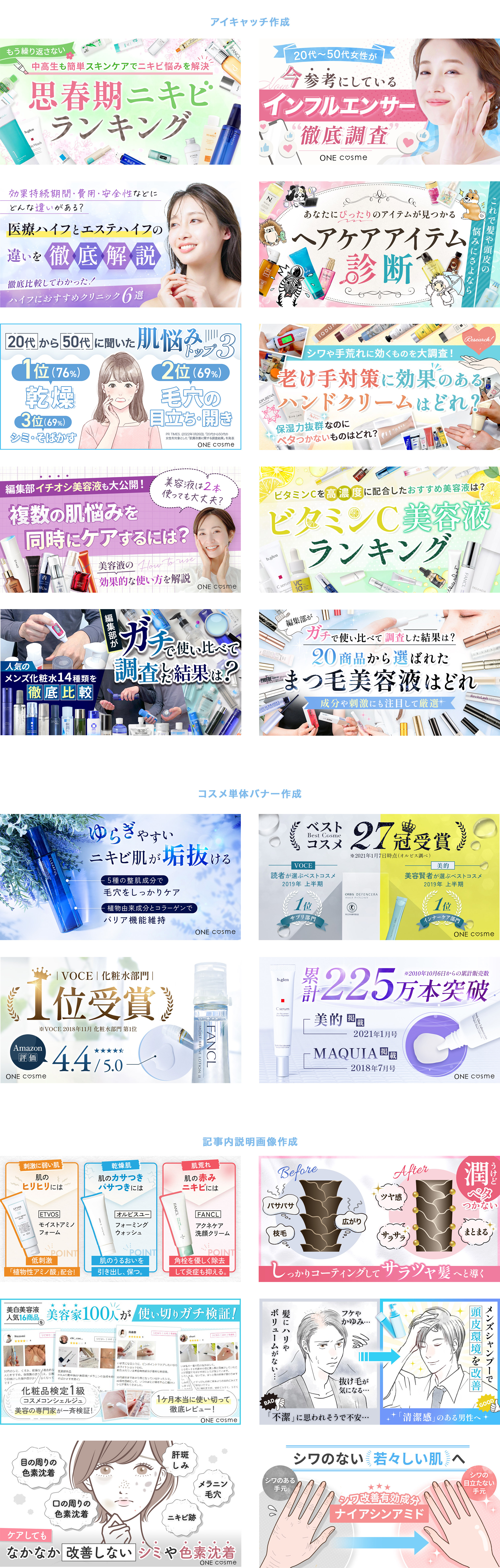 コスメ系サイト運営会社様 2026 3/19 制作内容 コスメ紹介ブログに掲載するアイキャッチ・記事内画像のデザインを担当。パッと見て記事内容が伝わる視認性と、華やかさで目を引くデザインを意識。スマホでも文字が読みやすいよう、文字周りの装飾サイズを細かく調整しながら制作しました。■担当範囲デザイン制作■使用ツールPhotoshop、Illustrator■制作期間1枚2〜4時間 バナー作成