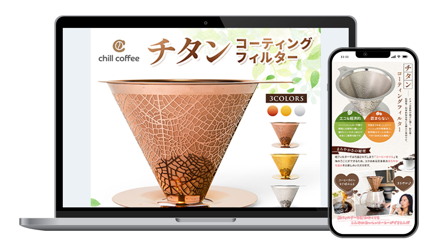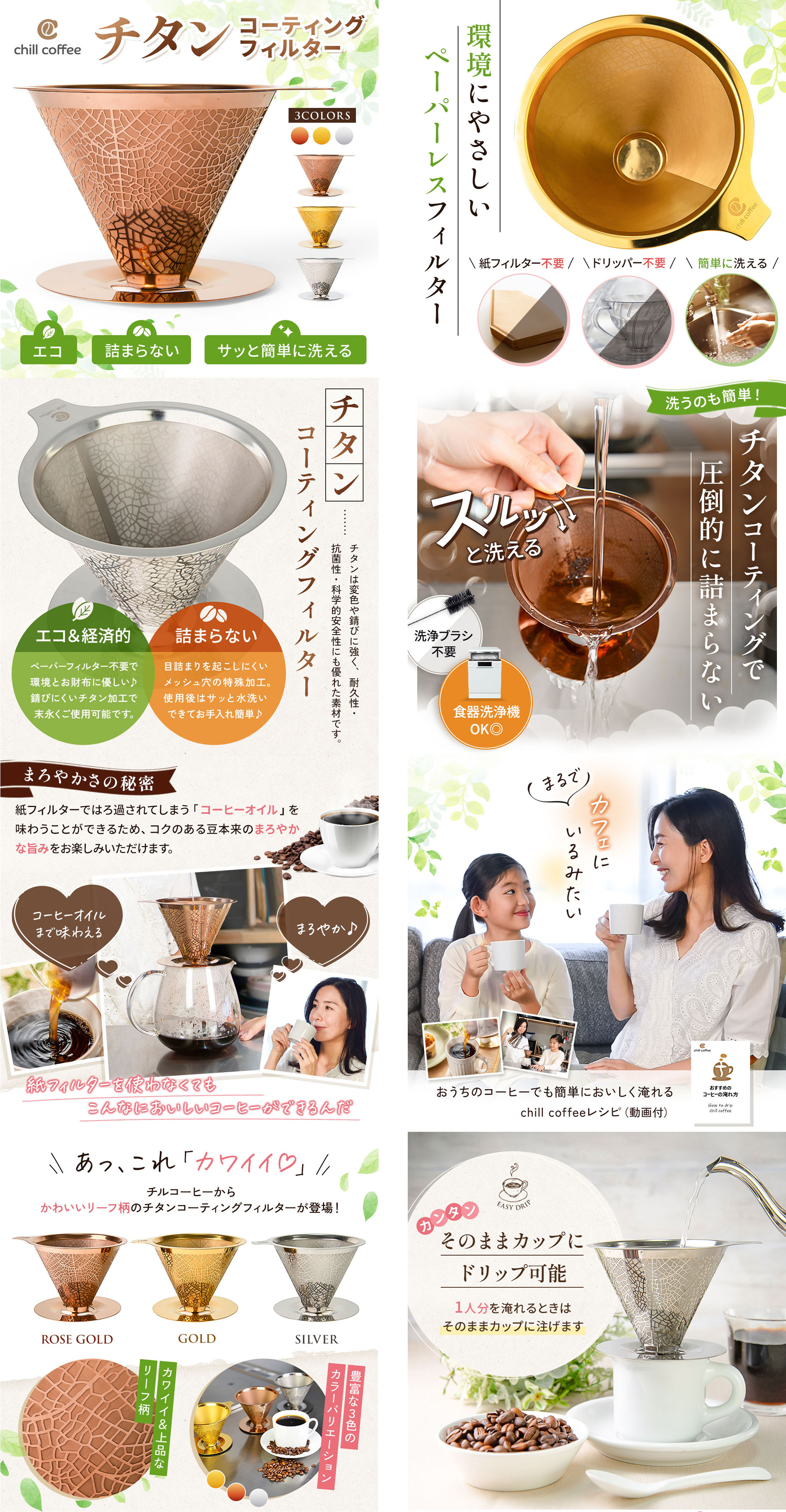 コーヒー器具販売店様 2026 3/19 制作内容 Amazon・楽天市場に掲載するコーヒー器具の商品LPデザインを担当。ターゲットである20〜30代女性に向け、商品のリーフ柄をモチーフにした背景パターンをデザインし、可愛らしさとナチュラルな生活感を両立した世界観に仕上げました。■担当範囲デザイン制作■使用ツールPhotoshop、Illustrator■制作期間3日 LP制作